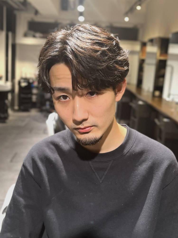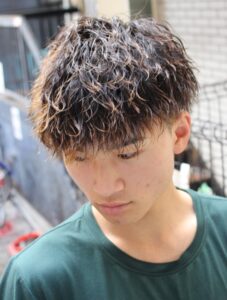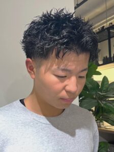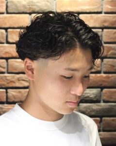 このパーマの魅力は、直毛で動きが出にくい髪質でも、簡単に立体感と存在感をプラスできる点です。スタイリングはドライ後にマット系ワックスやクレイを使い、毛先をつまむだけでOK。清潔感のあるフェードカットと合わせれば、バーバーらしい無骨さと都会的な洗練を同時に楽しめます。アクティブで個性を出したい人に特におすすめのスタイルです。